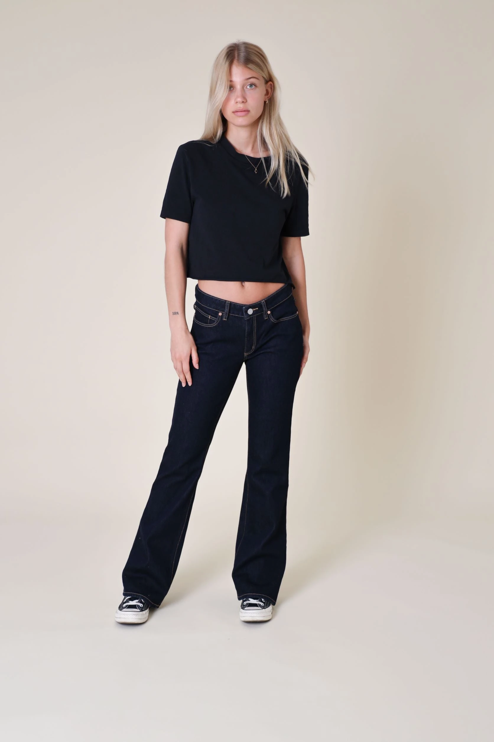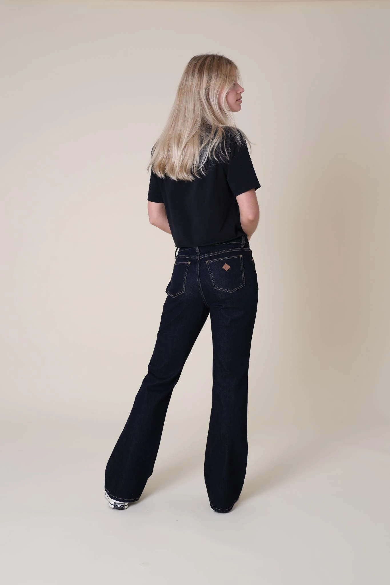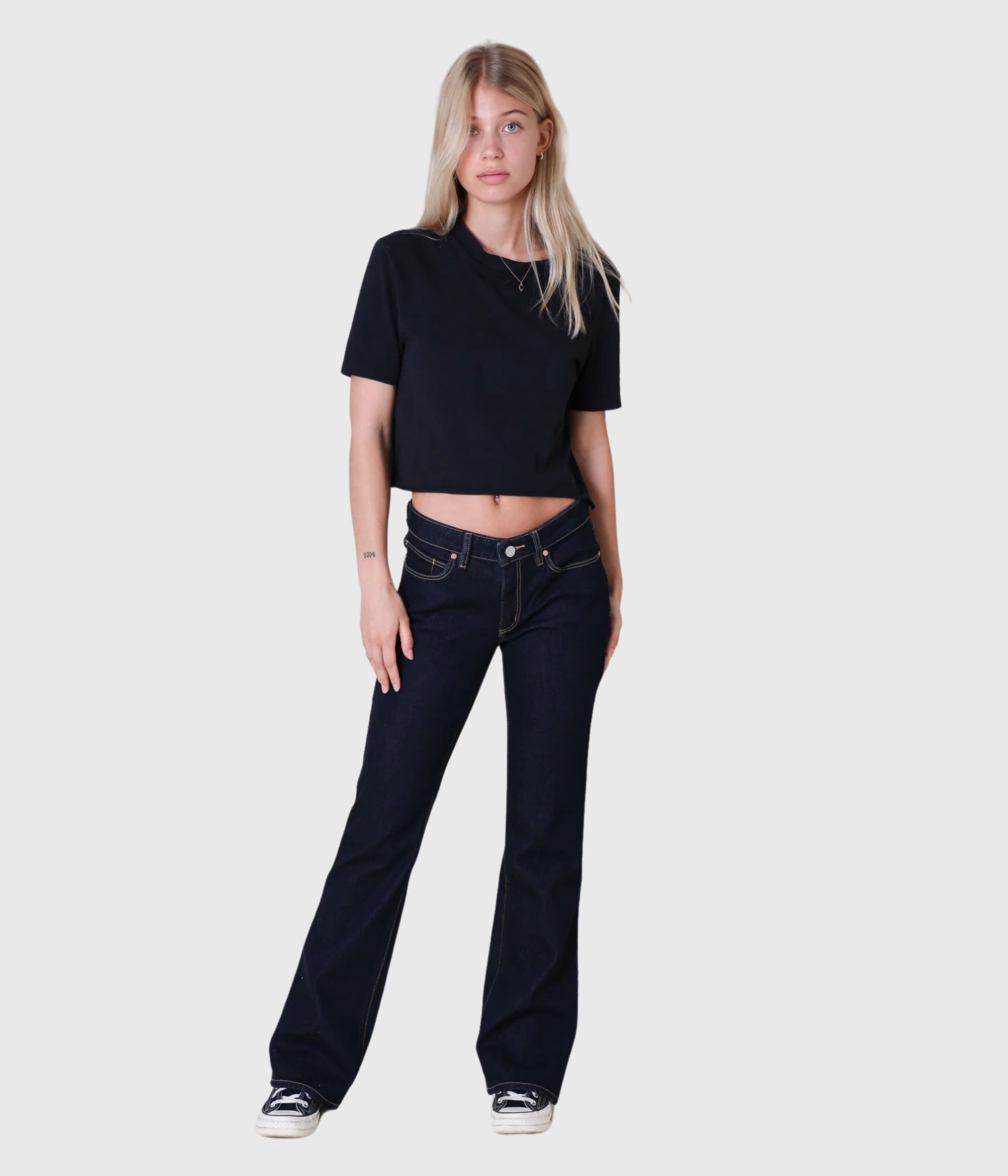 Ett par snygga bootcut jeans från A-brand med en låg midja. Femficksmodell med hällor för bälte i midjan. Stängs med dold gylf med dragkedja och knapp. Broderad, liten patch i läder på ena bakfickan.