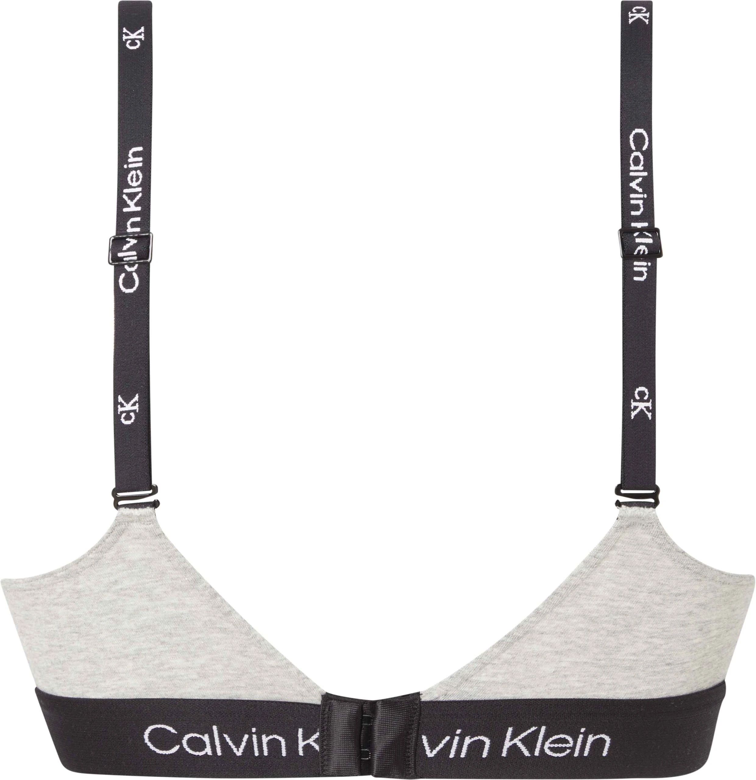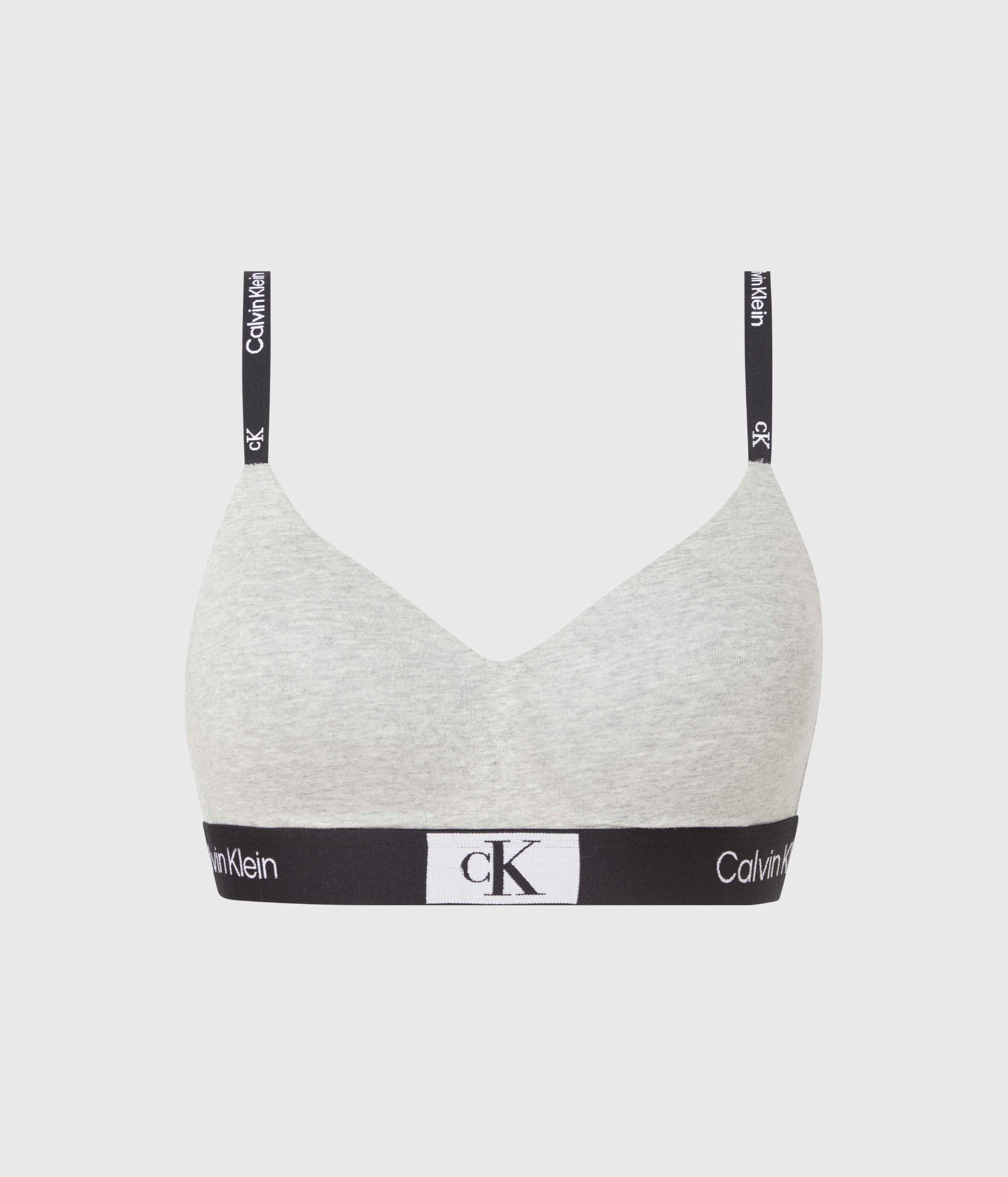 Grå bralette med mjuka kupor och justerbara axelband. BH:n har bred resår med logga nedtill och hysk- och hakestängning i ryggen.