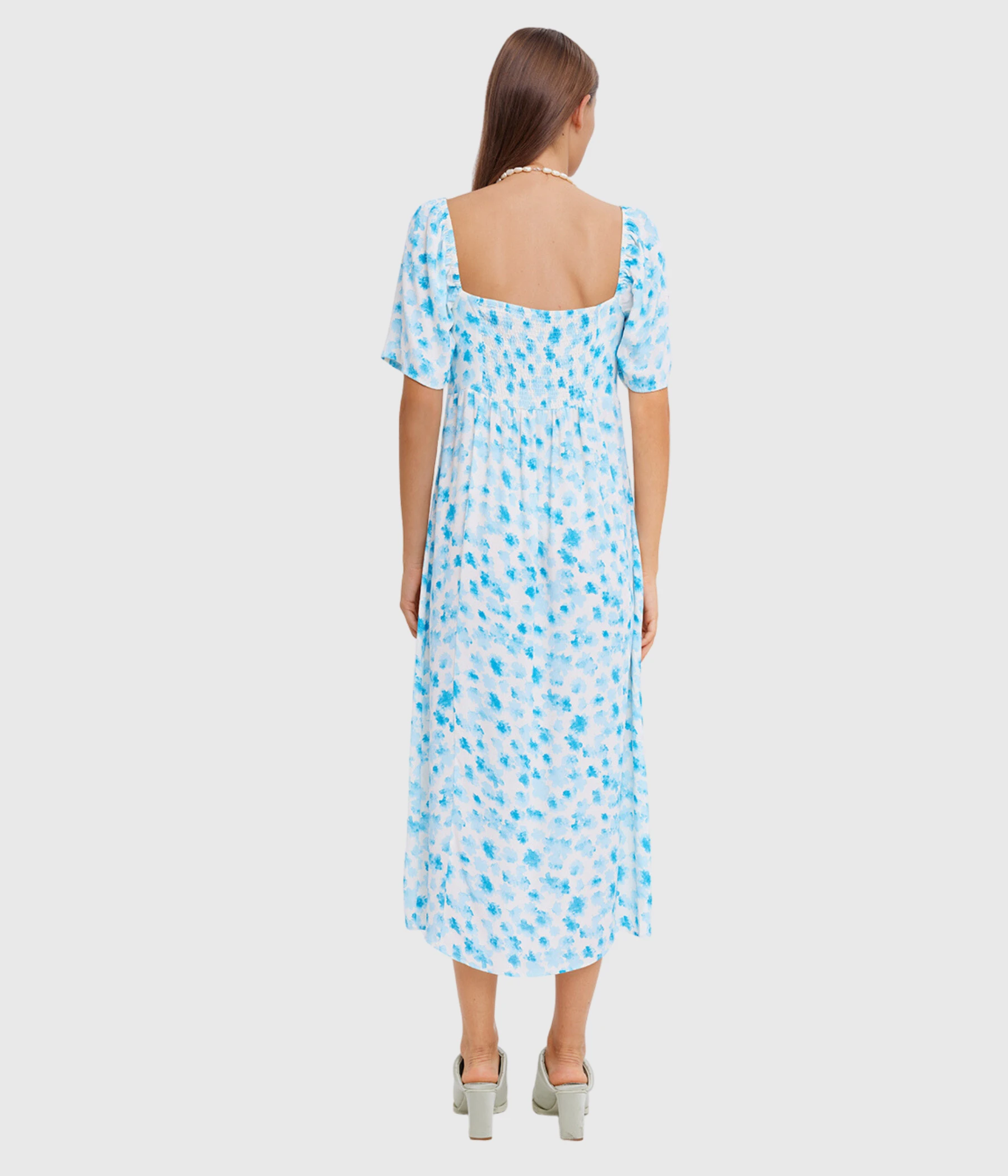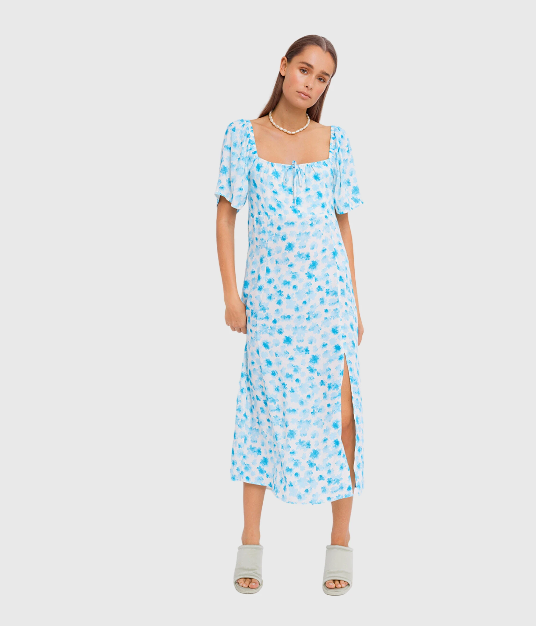 Somrig midiklänning från Envii. Designad i viskos med ett snygg fall i ett härligt blommönster. Klänningen har en djup, formad halsringning med knytband framtill och smock i ryggen som skapar en smickrande passform. Resår i axlarna och korta puffärmar med elastiska ärmslut.