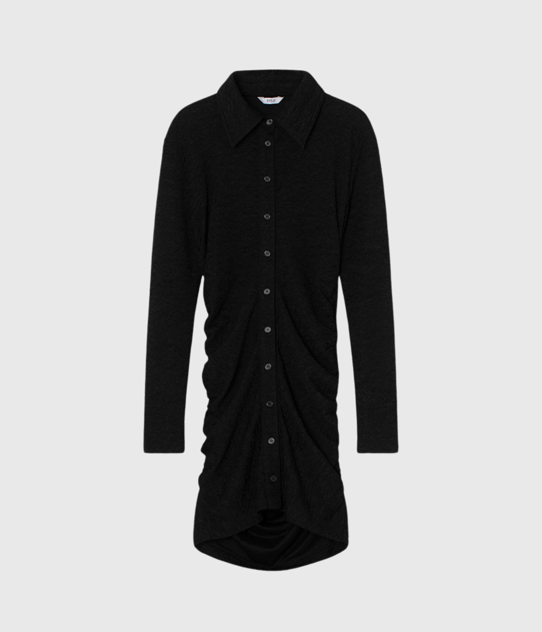 En figurnära midilång klänning från Envii i en klassisk svart färg. Klänningen är något högre i halsen med en krage. Urringningen kan justeras med knapparna.
