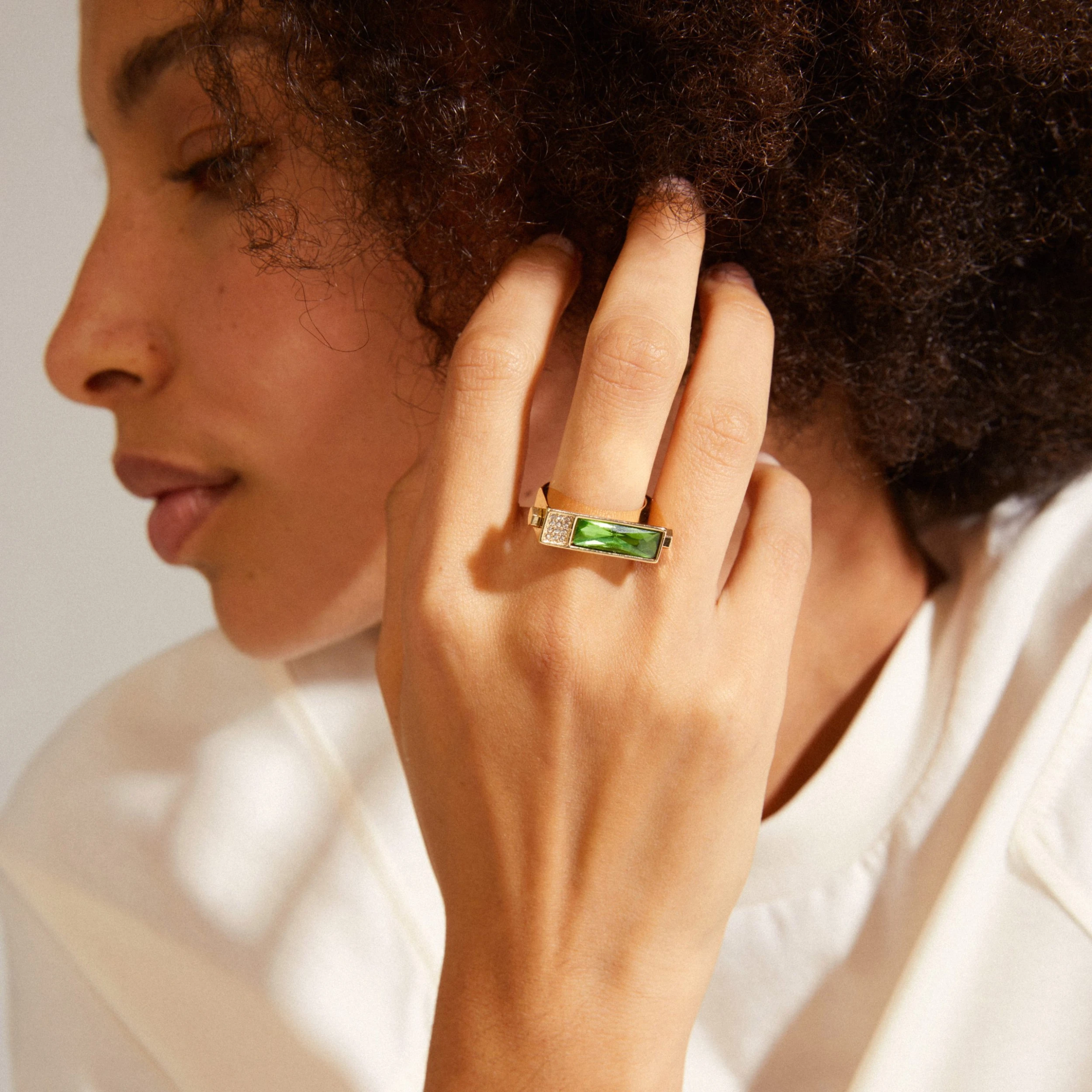 Guldpläterad ring i en trendig retro design med smaragdgrön kristall. En perfekt statement ring för dig som söker något elegant som passar perfekt in i dagens trender.