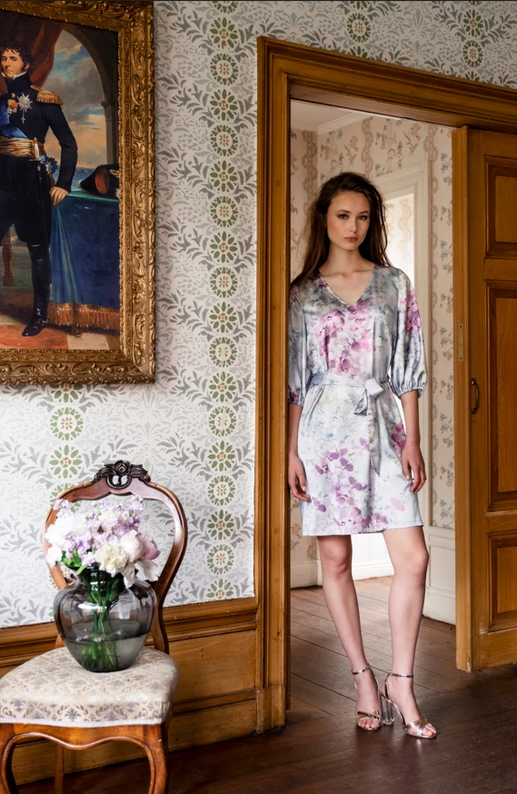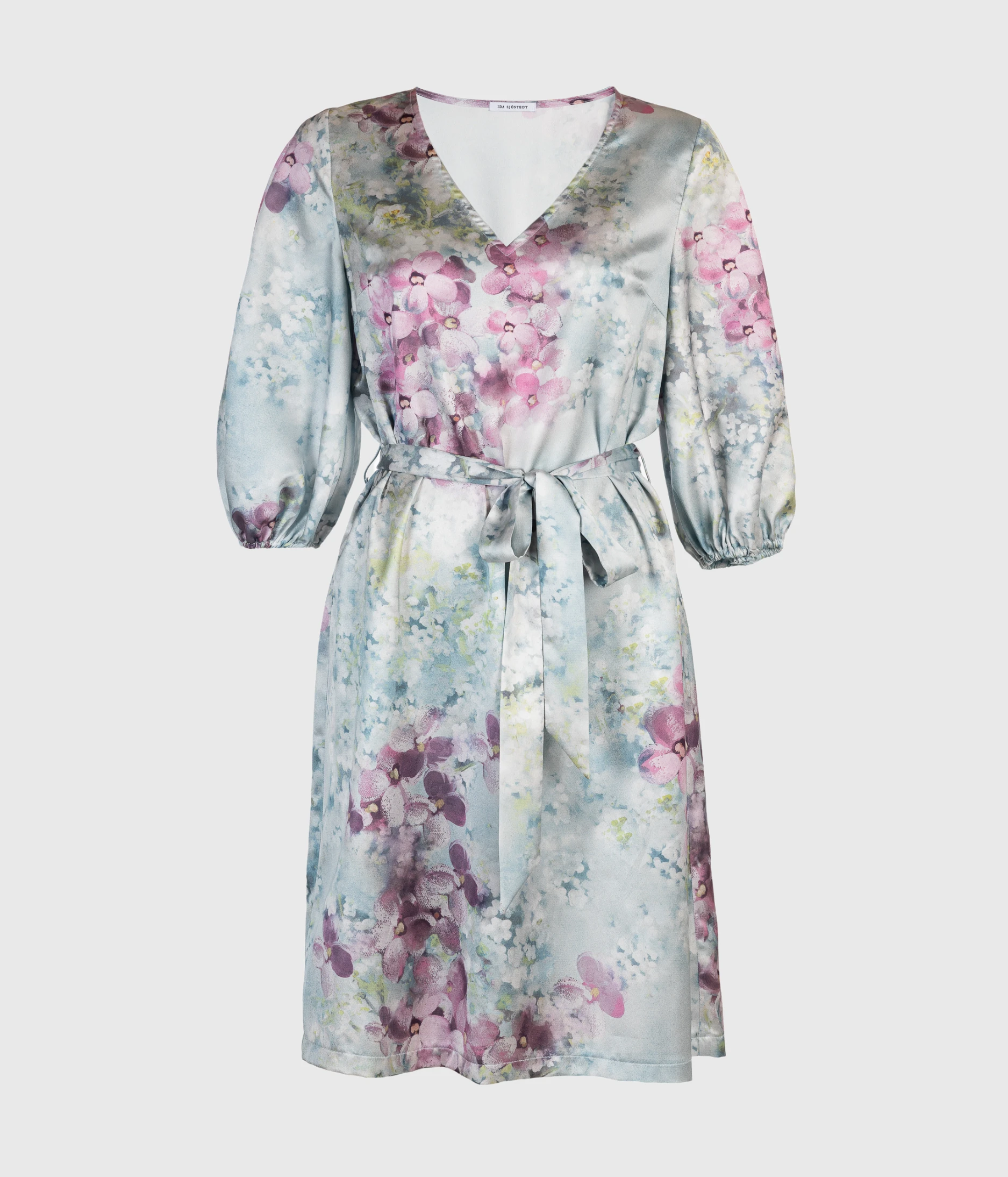Underbar, blommig klänning från Ida Sjöstedt. Klänningen är designad med en smickrande V-ringning och knyte i midjan som skapar en feminin och vacker siluett!