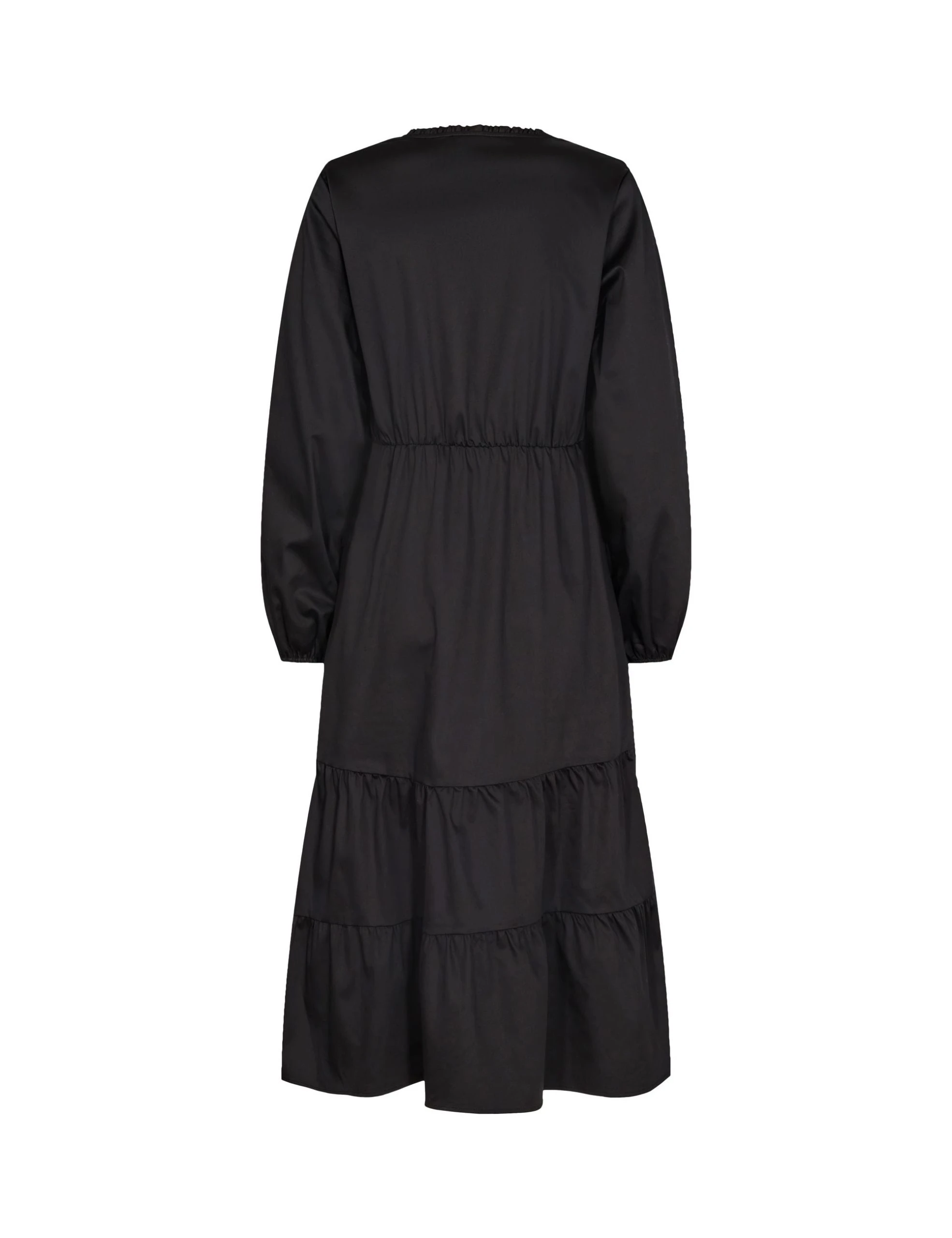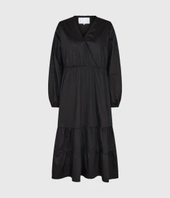 Lång avslappnad klänning från Leveté Room med fina detaljer. Klänningen har en fin v-ringning, volanger nedtill och en åtsittande midja.