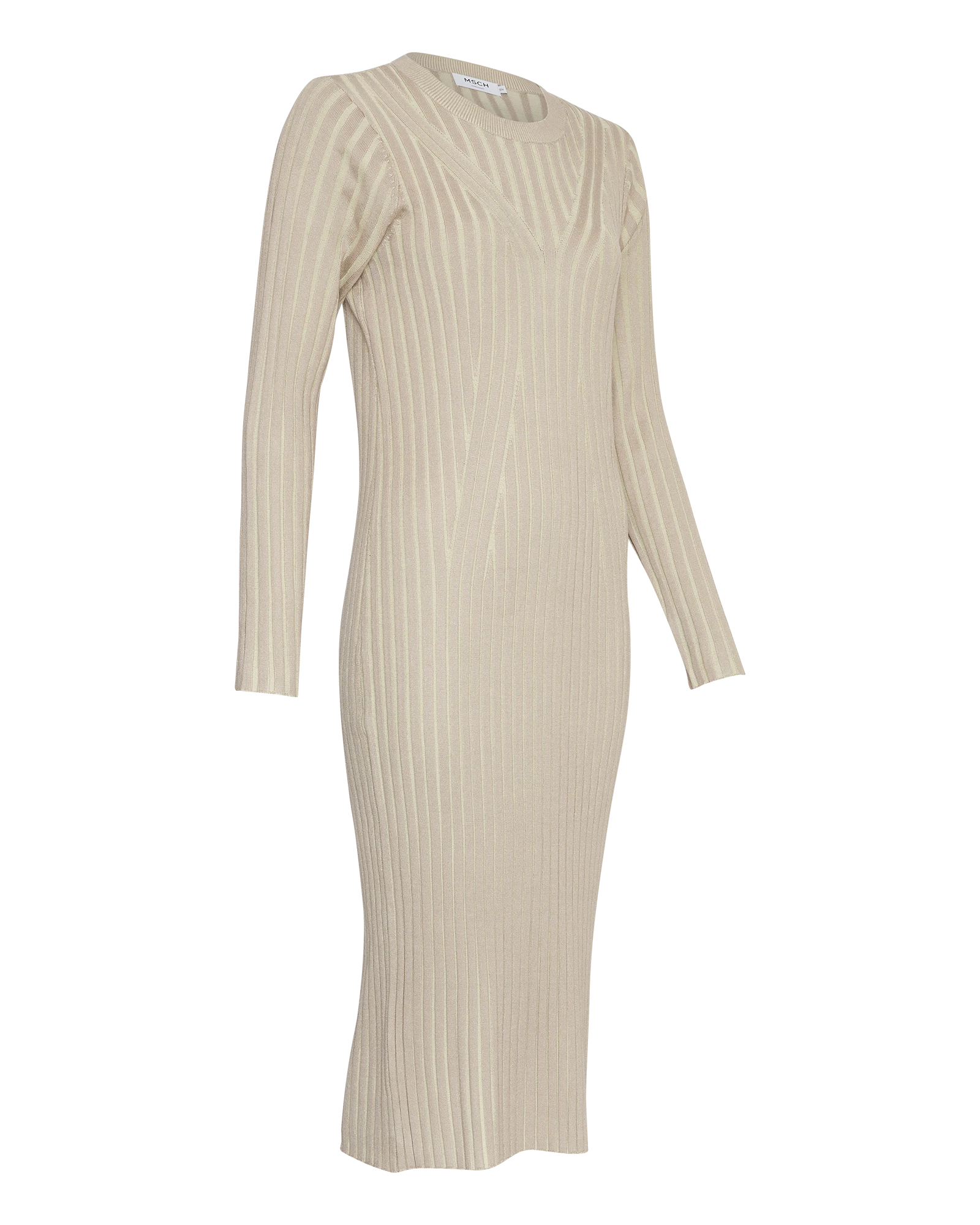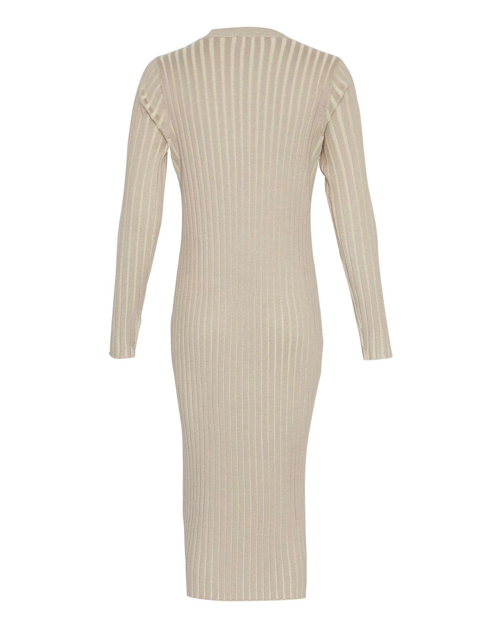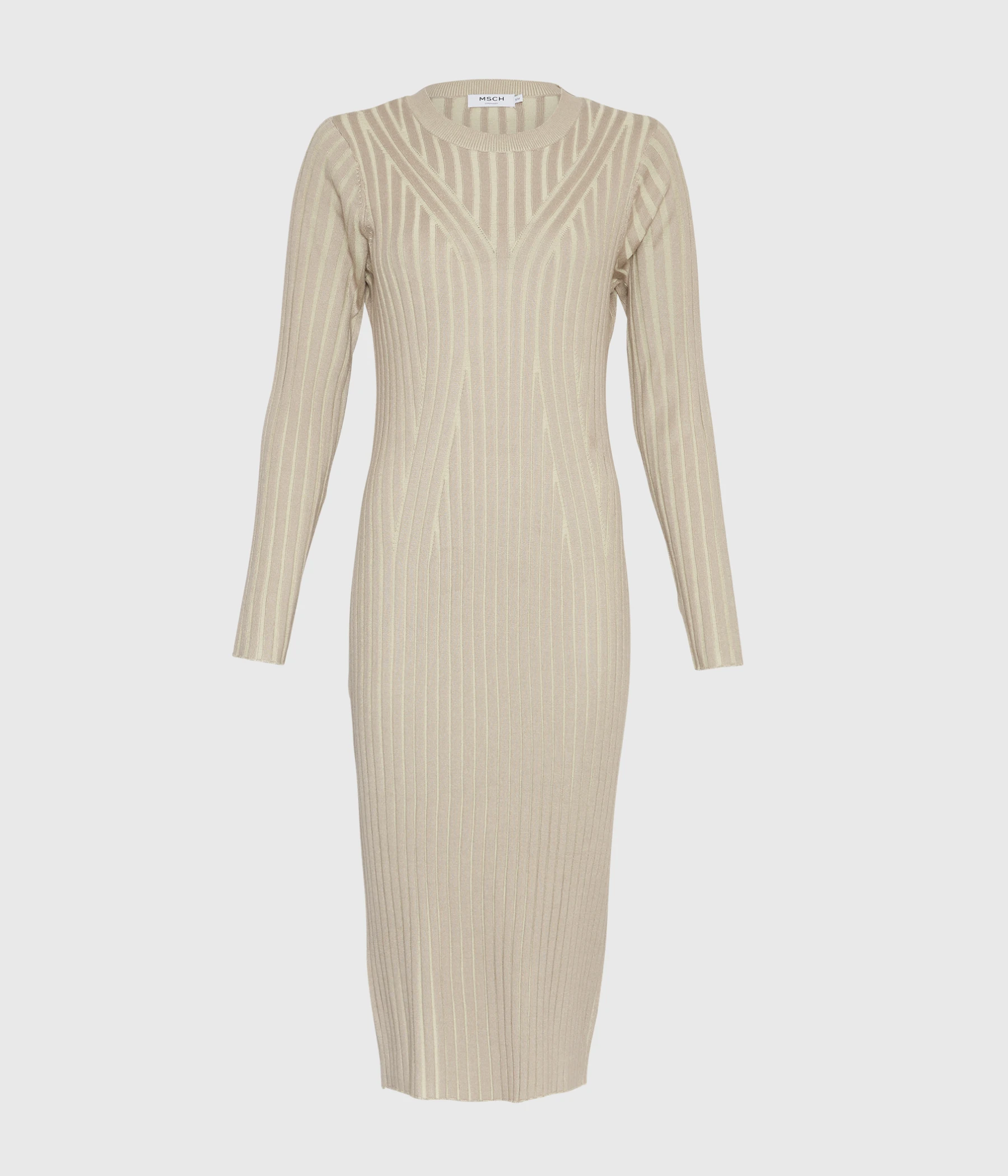 Kicka är en figursydd, stickad klänning från Moss copenhagen i en beige färg. Klänningen har ett fint mönster upptill som ger klänningen något extra!