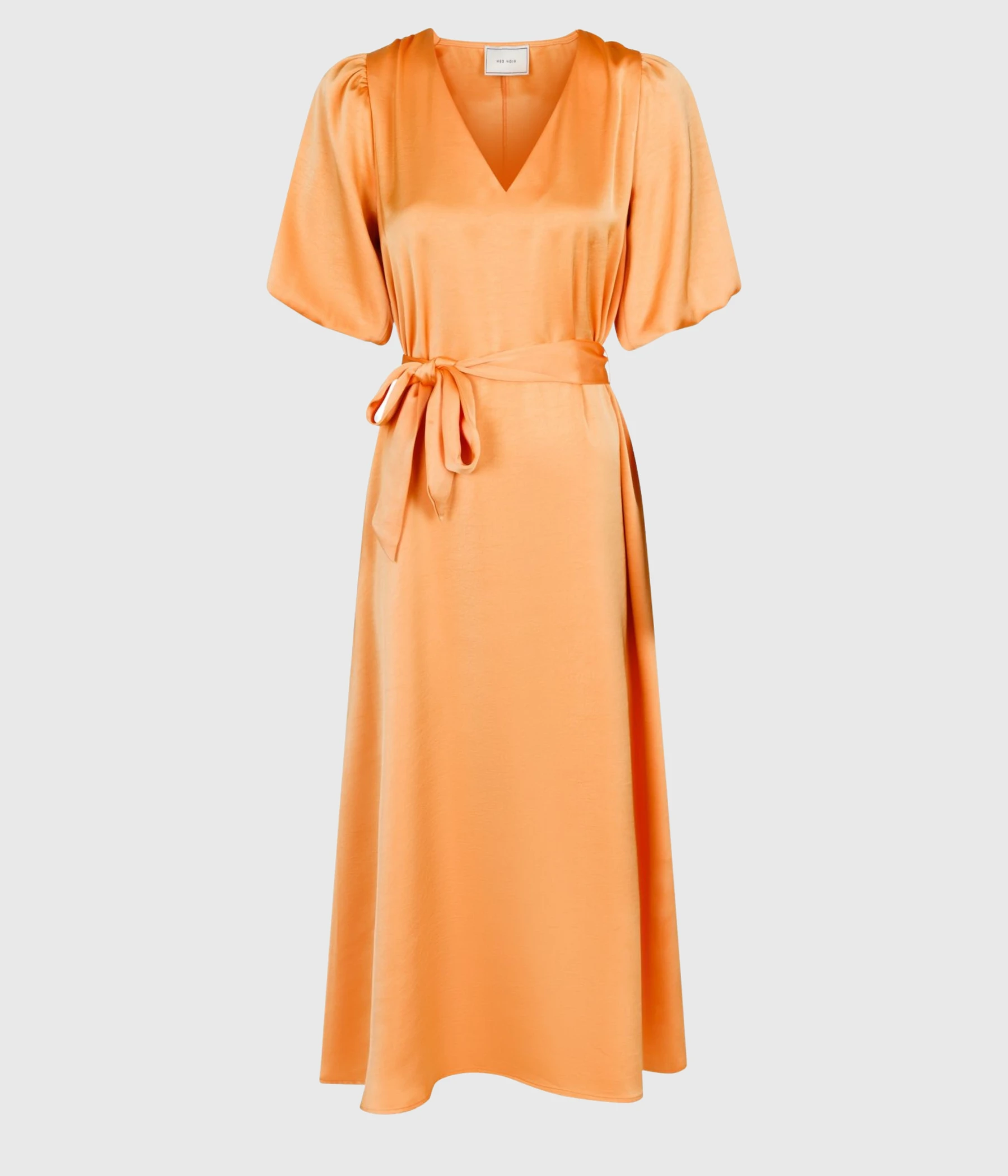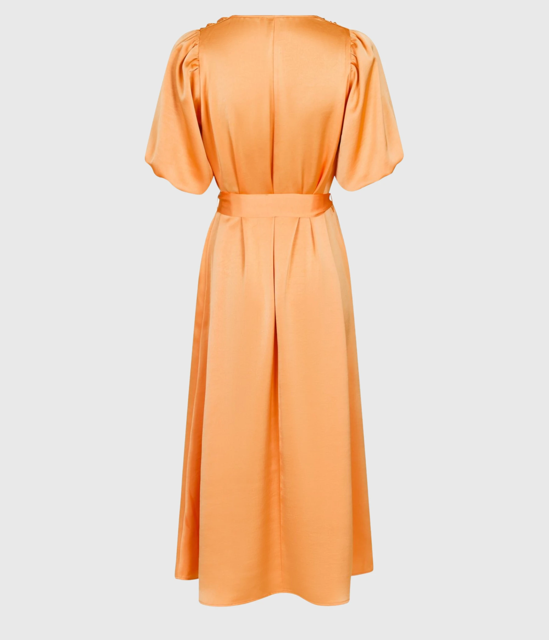Lång klänning från Neo Noir. Klänningen har korta puffärmar och en volangkjol. Klänningen kommer också med ett bälte som kan tas bort. Materialet är ett tungt tyg med satin kvalitet.
