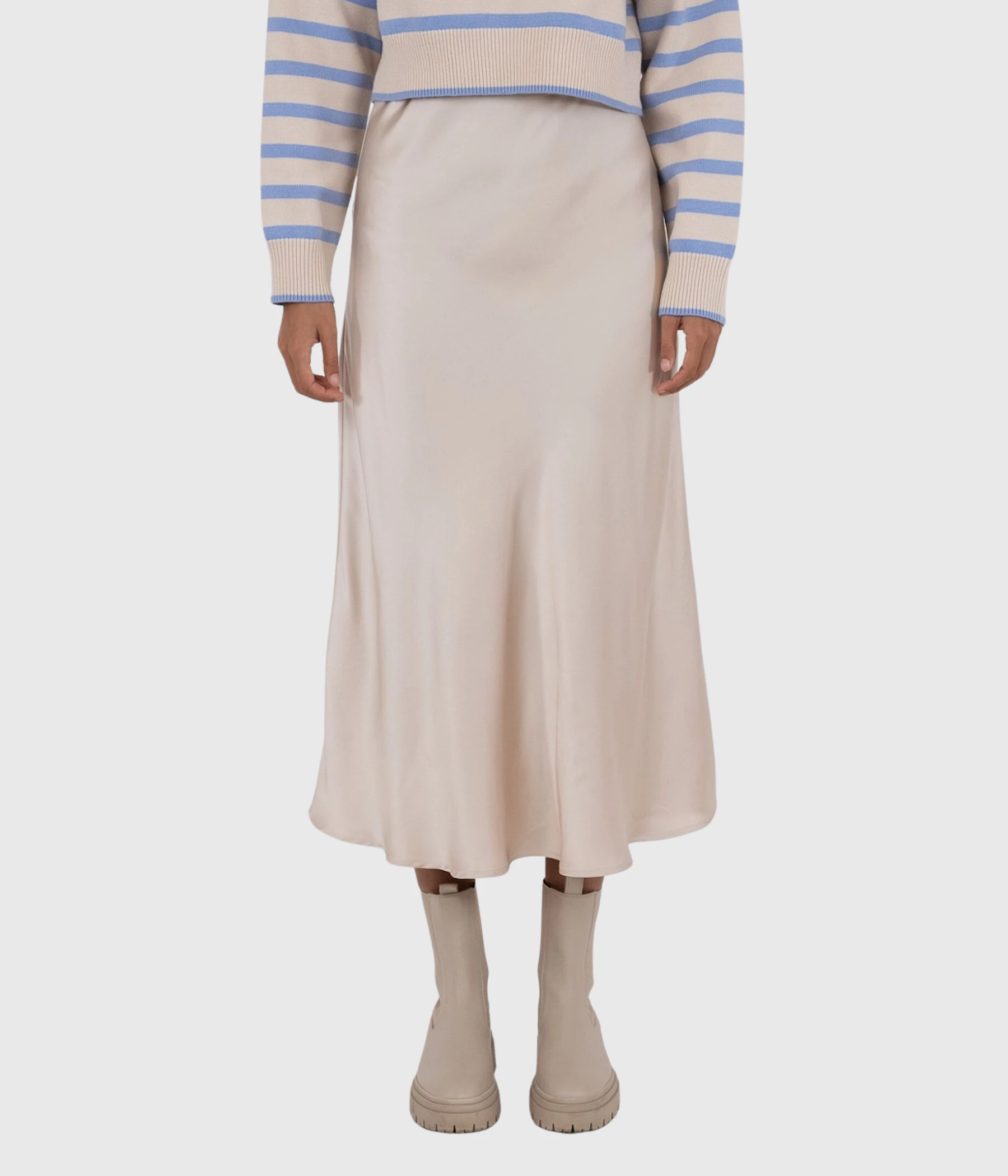Populära Bovary Skirt är tillbaka i en härlig champangefärg. Kjolen har ett elastiskt band i midjan och är precis lagom lång.