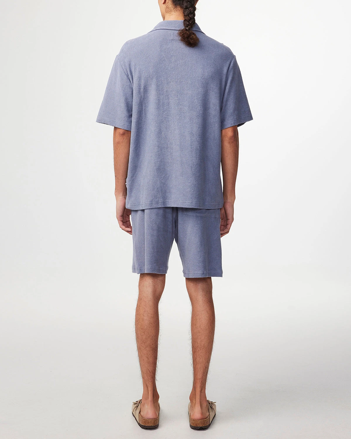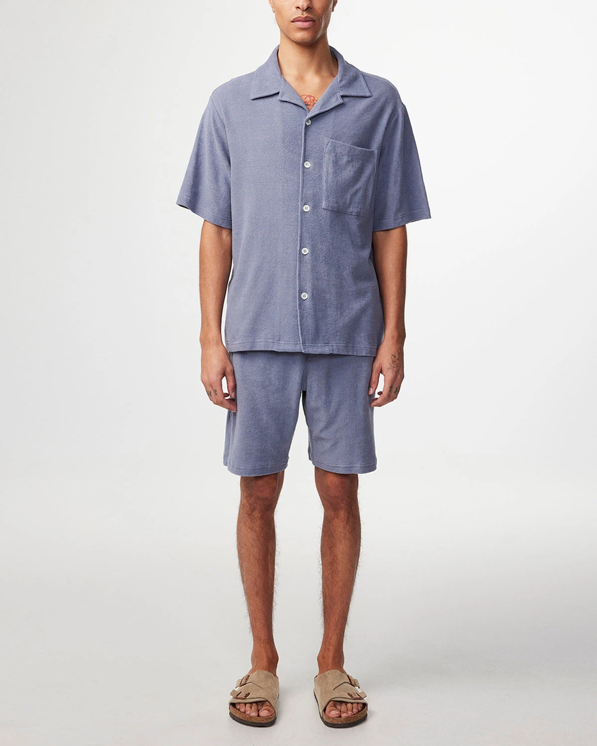 Kortärmad skjorta tillverkad i en mjuk frotté. Designad med öppen krage och enkel bröstficka. Toppad med pärlemorknappar.