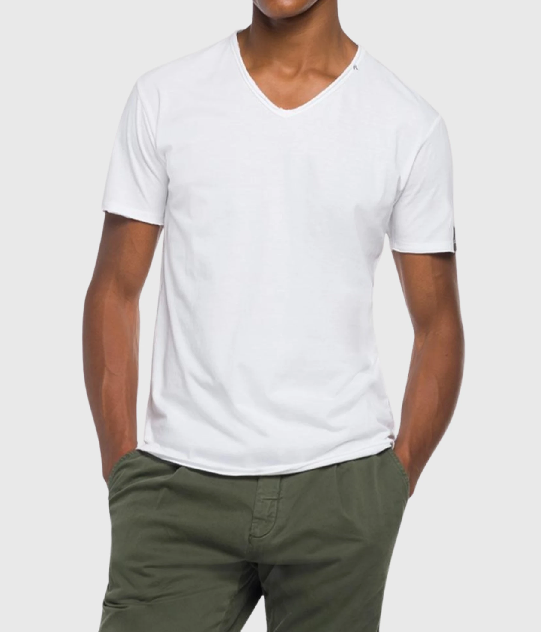 V-ringad bomulls-t-shirt med råa kanter, regular passform med sömm centrerad bak, kontrastsömmar med detaljer på kragen. Tryckt logo på ärmkanten och R-format broderi på kragen.