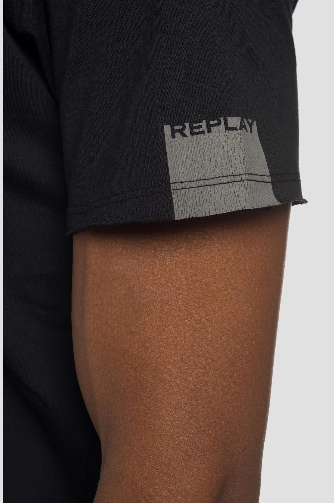 V-ringad bomulls-t-shirt med råa kanter, regular passform med sömm centrerad bak, kontrastsömmar med detaljer på kragen. Tryckt logo på ärmkanten och R-format broderi på kragen.
