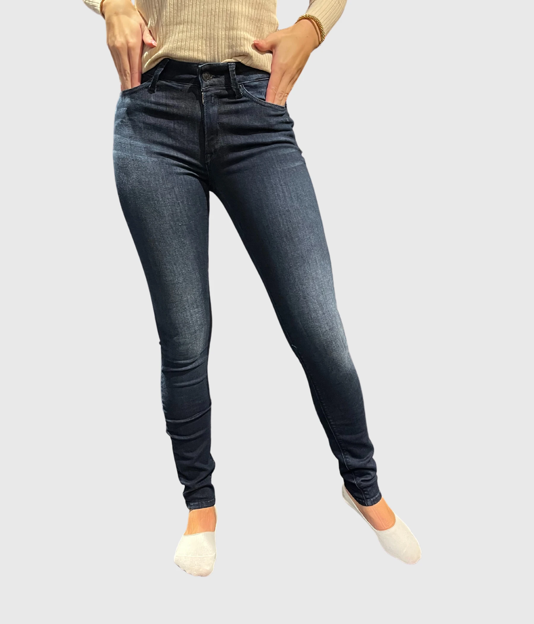 LUZIEN är ett par mörkblå skinny jeans från Replay och deras Hyperflex-kollektion. Midjan är högre och byxan går hela vägen ner till ankeln.