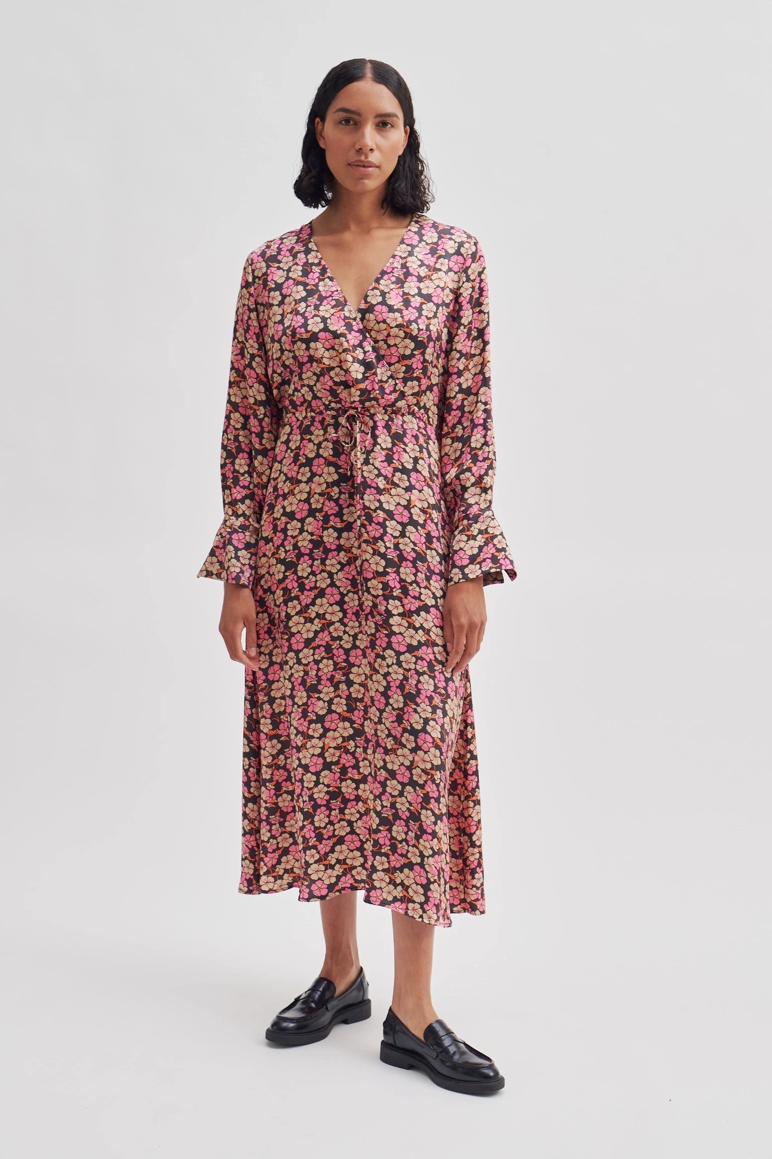 Klänning med V-ringad halsringning och markerad midja i ett blommigt mönster. Klänningen stannar strax efter knät och har ett fint fall. Perfekt klänning för våren och sommarens alla tillfällen!